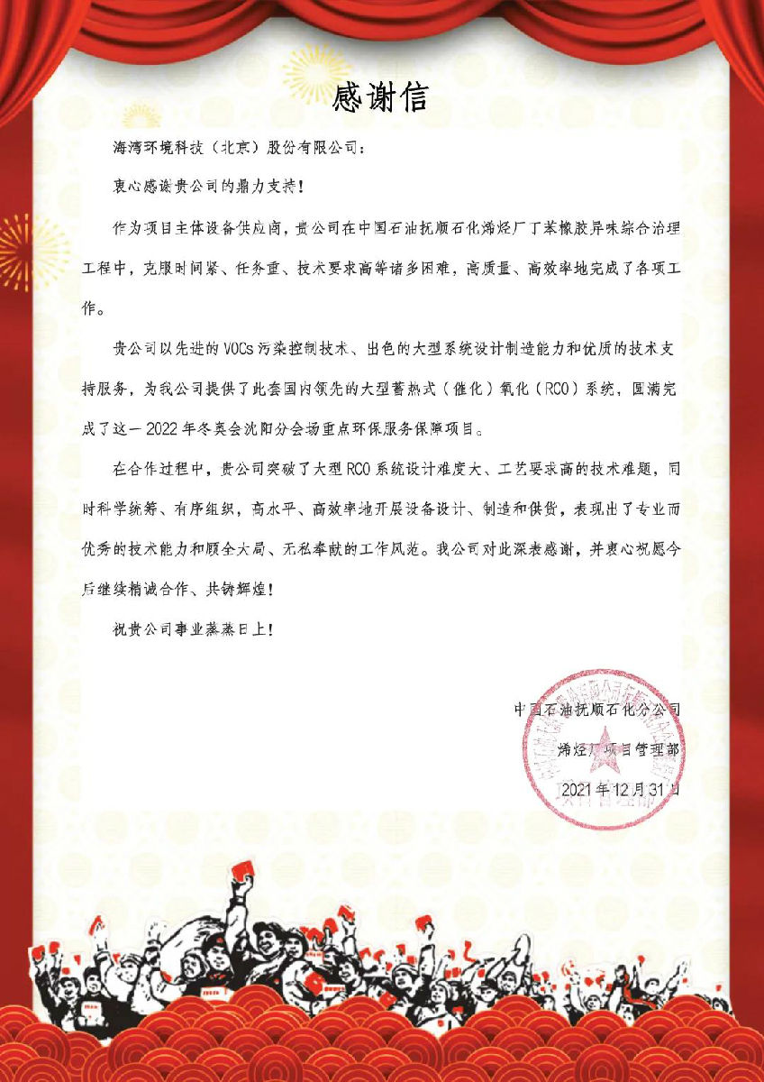 抚顺石化专程发来感谢信,高度赞扬海湾环境: